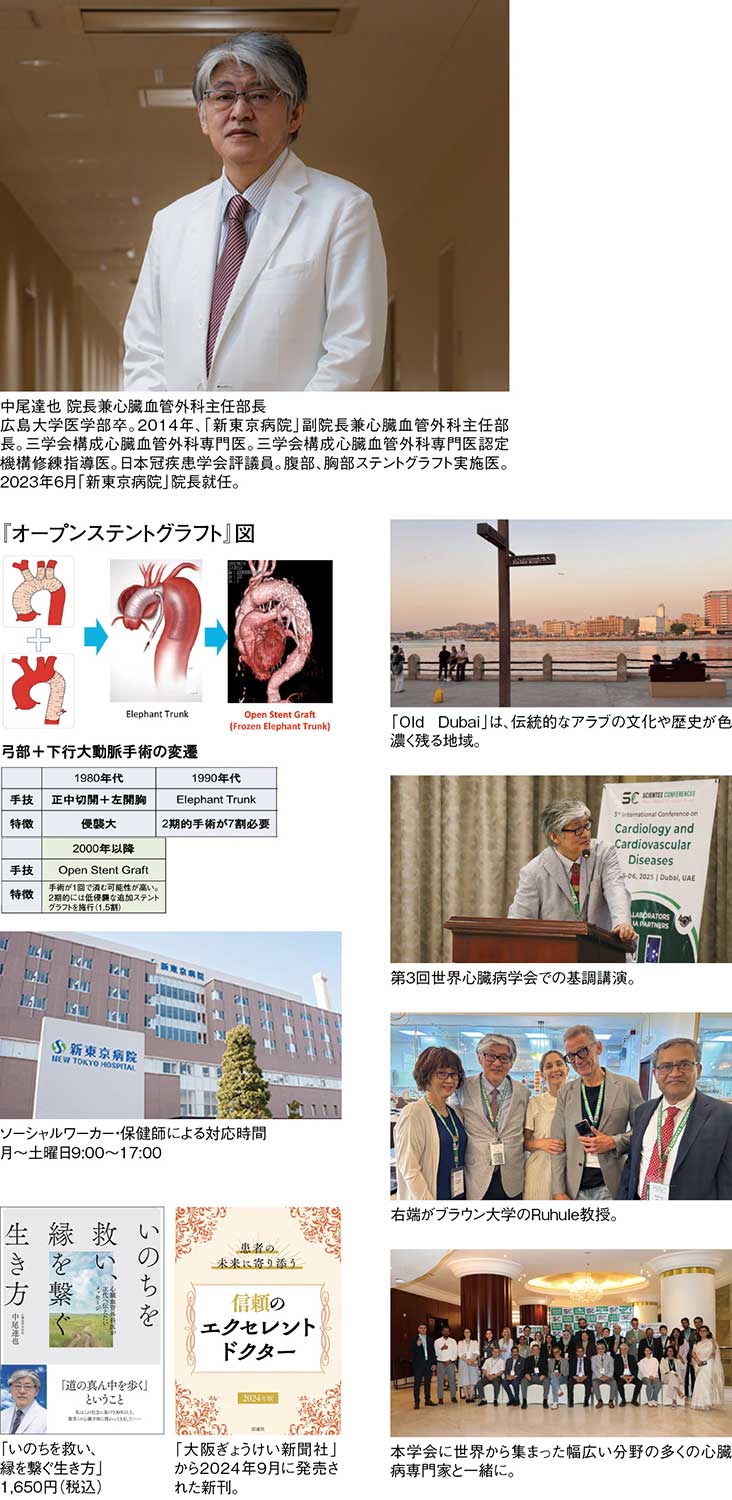 中尾院長は、『オープンステントグラフト法』を国内に広めると同時に海外での普及にも力を注ぐ。2025年にドバイで開催された「第3回心臓病および心臓管疾患国際会議議(3rdInternationalConferenceonHeartandCardiovascularDiseases)で基調講演を行い、「Frozenix」を用いた『オープンステントグラフト法』の有効性を発信した。アメリカの伝統校ブラウン大学のRuhule教授をはじめとする各国の心臓病専門家、心臓外科医、研究者たちと心臓血管医療の最新技術を共有、意見交換を行うなど、グローバルな展開を積極的に進めている。