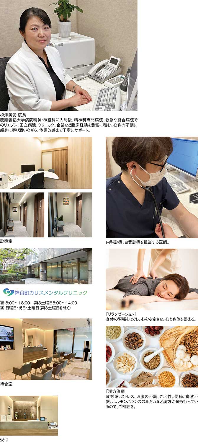 2024年に東京・神谷町に開院した『神谷町カリスメンタルクリニック』は、現代人が抱える様々な心と身体の不調に丁寧に向き合いながら、日々を少しでも軽やかに生きられるようサポートするメンタルクリニックだ。院長を務めるのは、精神保健指定医である松澤美愛先生。2008年に慶應義塾大学病院精神・神経科での勤務を皮切りに、精神科専門病院、救急・総合病院でのリエゾン診療、国立病院、企業の健康管理室など、多様な現場で豊富な経験を積んできた。治療では、患者さん一人ひとりの背景やライフスタイル、体質に合わせた丁寧な対応を心がけており、表面的な症状だけでなく根本からの改善を目指す姿勢で多くの信頼を集めている。