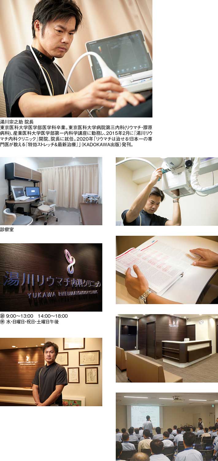 同院では、患者さんの声にしっかりと耳を傾け、症状だけでなく生活背景や将来の希望までを丁寧に把握したうえで、MTXやTNFα阻害薬やIL|6受容体阻害薬などの7種類の生物学的製剤のなかから、患者さんの状態や副作用への配慮、ライフスタイルとのバランスに応じて最適な治療法を組み立てる。湯川院長は、「リウマチによる休職・退職・廃業、さらには育児や介護の困難がゼロとなる社会をつくりたい」という想いのもと、臨床にとどまらず、リウマチに対する正しい理解を広める啓発活動にも注力する。地域間の医療格差や情報の偏在といった課題や必要な医療が届いていない現状を受け、『一般社団法人リウマチ医療・地域ネットワーク協会』を設立。書籍出版など、リウマチの患者さんに役立つ情報の発信、市民向けの講演会を開催するなど、全国の患者や医療者がつながる仕組みづくりに取り組んでいる。院内は、空港のラウンジのようなリラックスできる落ち着いた雰囲気が特長。プライバシーを重視し、個室の診察室が2室用意されている。また、院内セカンドオピニオンもあり、本当に自分に合った治療なのかを確認しながら、治療をすすめることができる。薬を処方するだけでなく、患者の想いに耳を傾け、共に歩む、確かな専門知識と温かな対応で、患者さんの未来にしっかりと寄り添い、前向きな治療を支えている。