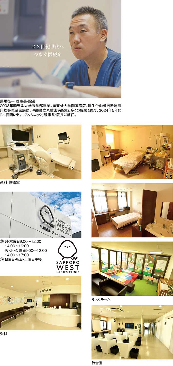2005年に開院した『札幌西レディースクリニック』は、万全のサポート体制で女性とその家族に寄り添い、妊娠や出産を支えてきた産婦人科。全身となる「ながせ産婦人科医院」の伝統を受け継ぎ、札幌市西区近郊の女性たちの頼れるかかりつけ医として厚い信頼を得ている。馬場征一院長は、女性が安心して出産・育児や治療に臨むことができるよう、やさしく丁寧な診療を心がけている。患者さんにとって何が最善かを常に考えながら、安心してマタニティライフを過ごすことができるよう、医療を提供する。