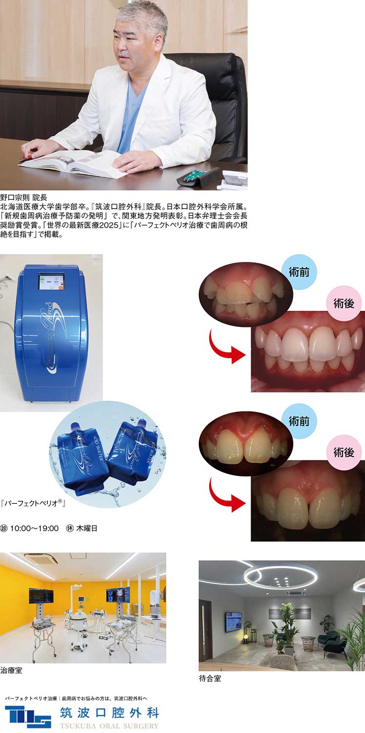 細菌によって歯周組織の炎症や破壊を起こし、歯が抜けてしまう歯周病の治療で注目されているのが『筑波口腔外科』の野口宗則院長が特許を取得した口腔殺菌消毒薬『パーフェクトぺリオⓇ』を用いた治療法だ。