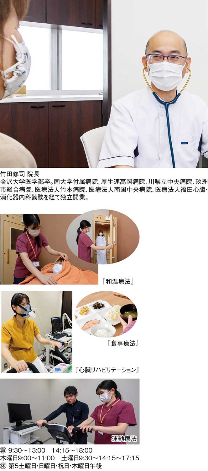 循環器内科と内科を診療科目に掲げる『クリニック四万十』の竹田修司院長は、循環器系疾患の治療で実績を重ねる医師だ。特に『和温療法』と『心臓リハビリテーション』は、臨床経験と専門知識の結晶だ。