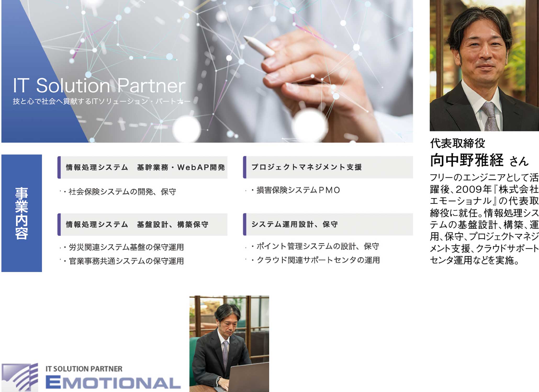 ITサービスの総合商社『株式会社エモーショナル』代表取締役の向中野雅経さんの思いだ。在籍メンバーはただ粛々と仕事をこなすのではなく、経営理念にもある「心」を常に念頭に置いて各種サービスを提供する業務にその思いが表出する。