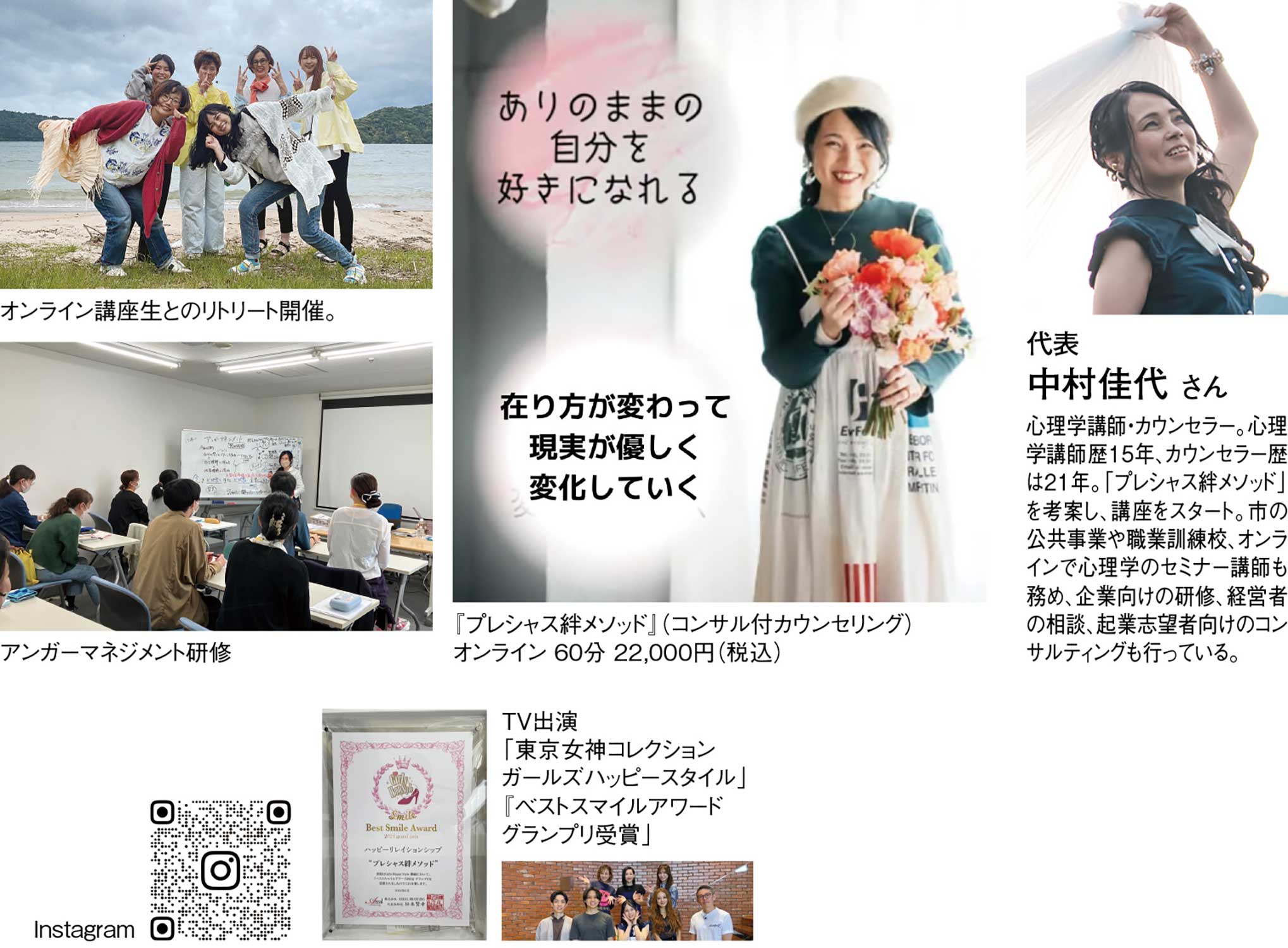 「自分を愛し、人からも愛される人生」、誰もが願う理想の人生。それを実現させるのが『プレシャス絆メソッド』。心の奥底にある自分を知ることで、心・体・声が一致するようになり、愛が深まるコミュニケーションが取れるようになるメソッドだ。代表の中村佳代さんが開催する講座では、自分を愛することで、人からも愛される生き方をコミュニケーションの技術として、少人数のグループワークで学んでいく。「本当の自分を大好きになる」「環境と感情に振り回されなくなる」「在り方で現実が優しい世界に変わる」という三つのステップを実践的に進めていくことで、自分の本心を知り、それを大切にしながら、声や体の表現も素直にできるようになるという。心理分析やグループワークの中から、集まったグループの状況に合わせた内容をオリジナルで組み込んでもらえるので、実現性が高い。参加者同士で励まし合い、共に成長していく一体感も魅力的だ。ソーシャルスタイル理論をベースにしたコミュニケーション理解の企業研修が好評。経営者の方からも、在り方で変わる光のフィクサーとして能力を高く評価されている。また、潜在意識を扱うタロットリーディングを使って、テレビ局の占いコーナーも担当している。