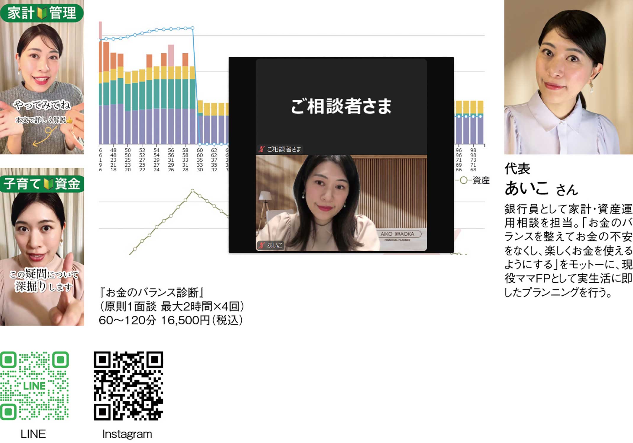 家計管理や将来への備え、教育資金、住宅購入など、お金にまつわる悩みごとを、実生活に即した現実的なプランニングで丁寧にサポートする『預金・保険・投資バランス診断FP』。代表のあいこさんは、銀行員として14年間勤務し、数百世帯以上の家計や資産運用の相談に携わってきた経験と、3児の母としての視点を活かし、「今の自分と家族に合ったお金の配分」を、無理なく具体的に提案してくれる。Zoomでの個別面談では、現在の家計状況や家族構成を丁寧にヒアリングし、ライフプランシミュレーションを作成。教育資金や老後資金、保険・投資のバランス設計まで、各家庭に寄り添った実現可能なアドバイスが受けられる。「貯金ばかりでお金が増えない」「保険が適正か分からない」「投資のリスクが不安」といった、一人ひとり異なる悩みに対しても、教育資金や老後資金の準備方法、保険や投資商品の見直しなど、多角的な視点で対応。子育て世代に寄り添ったライフプランの提案や制度改正のタイミングに合わせたアドバイスも好評だ。難しいお金の話も、わかりやすく説明してくれるので、初めての方でも安心して相談できる。(ライター/彩未)