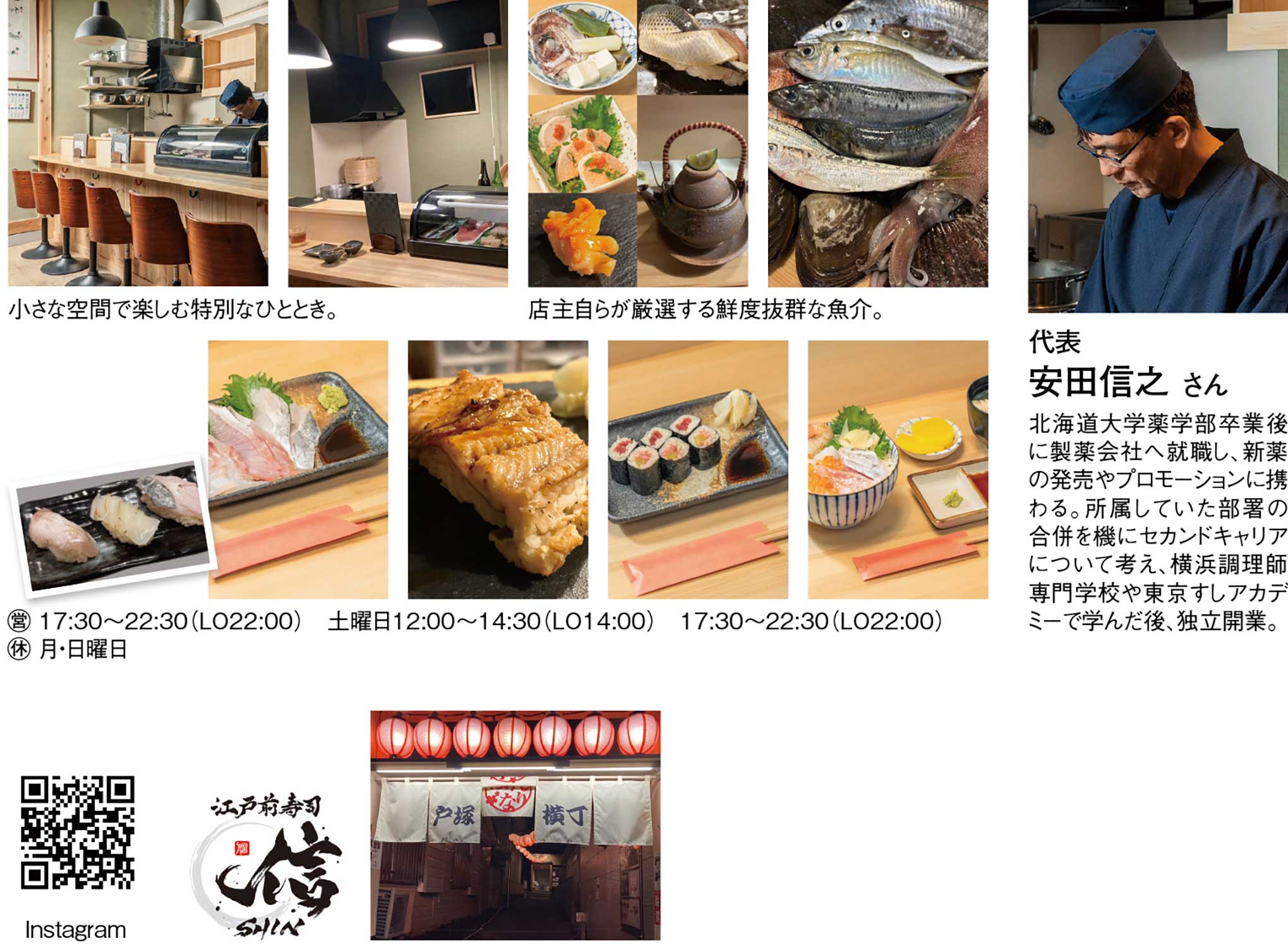 店主自ら横浜市中央卸売市場で厳選し仕入れた新鮮な魚介を使用した本格握り寿司が楽しめる『江戸前寿司信』。良質なネタと、赤酢と米酢を合わせたシャリとの絶妙なバランスが評判を呼び、多くの寿司好きに支持されている人気店だ。代表の安田信之さんは、コロナ禍で両親を亡くしたことをきっかけに、「やり残しのない人生を生きたい」と強く思い、長年勤めた会社を退職。飲食店の開業を目指し、調理師専門学校で基礎から料理を学び直した。趣味の釣りで釣った魚を使った寿司が「刺身より美味しい」と好評だったことをきっかけに、寿司職人養成学校に入学し、2023年に『江戸前寿司信』を開業した。コハダやイワシ、貝、真鯛や穴子などの鮮魚は、すべて自身の手で一匹ずつ丁寧にさばく。江戸前の伝統技法で、魚本来の持ち味を最大限に引き出すことを大切にしている。店内は、カウンターの7席のみ。お客様との会話を楽しみながら、一人ひとりの好みや体調に合わせた寿司を一貫ずつ丁寧に握るスタイルを貫く。お客様の「おいしい」という言葉を励みに、今この瞬間にしか出せない味を提供している。