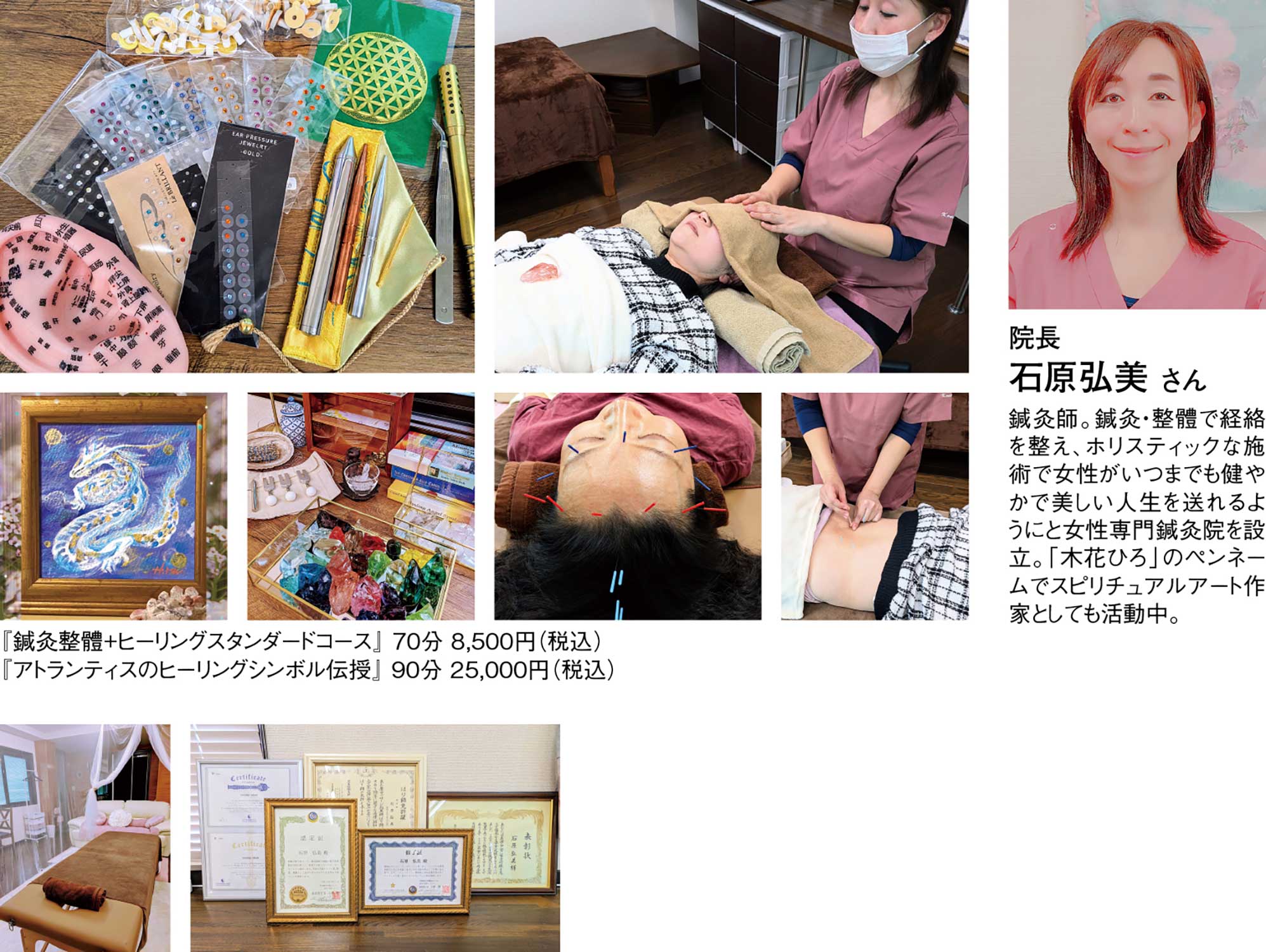 東洋医学の知識とスピリチュアルな視点を融合させ、女性の健やかな身体づくりをサポートする『SpiritualCare鍼灸院このはな』。院長の石原弘美さんは、鍼灸師や本草閣自然療法センターDr.Ken認定・量子波マスターヒーラー、アロマテラピーアドバイザーなど幅広い資格を有するエネルギーヒーラーだ。『鍼灸整體+ヒーリング』では、ベーシック、スタンダード、スペシャルの3コースが用意されているのが特長。てい鍼を使用して経路に刺激を与える鍼灸と気・血・津液の循環を促して経絡を調整する整體、エネルギーヒーリングなどの施術を基本に、コースによってカラーセラピーやクリスタル、フリークエンシーなどを取り入れた多角的なアプローチで心・身体・マインドを総合的に整える。