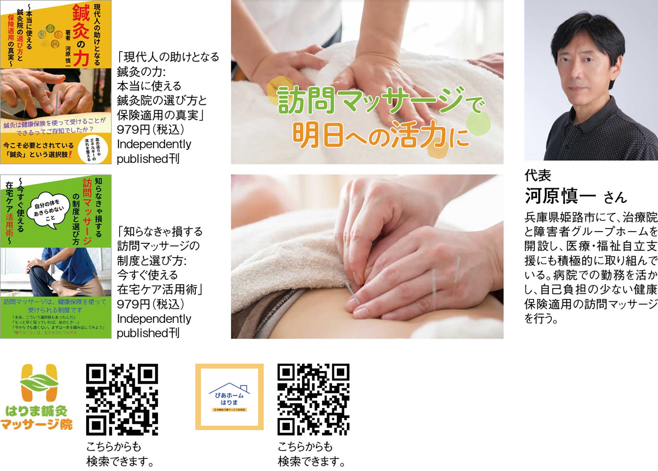 『はりま鍼灸マッサージ院』代表の河原慎一さんは、患者さん一人ひとりの症状や体質に合わせた丁寧な施術で信頼を集めている。鍼灸の魅力や正しい知識を広めるため、河原さんは2冊の著書を執筆している。「現代人の助けとなる鍼灸の力:本当に使える鍼灸院の選び方と保険適用の真実」では、鍼灸院の選び方や保険適用に関する正しい情報をわかりやすく解説している。多くの人が疑問に思う鍼灸治療の実態や安心して通える治療院の見分け方を紹介し、鍼灸に対する理解と信頼を深める内容だ。「知らなきゃ損する訪問マッサージの制度と選び方:今すぐ使える在宅ケア活用術」では、自宅で受けられる訪問マッサージの制度や活用法を詳述している。高齢者や身体の不自由な方、忙しい現代人にとって有益な在宅ケアの具体的な利用方法を紹介し、生活の質向上を支援する内容。医療保険で訪問鍼灸マッサージが医師の同意書が必要だが受けることができる本で、施術と書籍を通じて、河原さんは自然治癒力を引き出し、心身の調和を目指す鍼灸の力を伝えている。現代社会の健康課題に寄り添い、誰もが元気な毎日を送れるようサポートする頼もしい存在だ。また、別事業で「障がい者グループホームぴあホームはりま」を運営している。