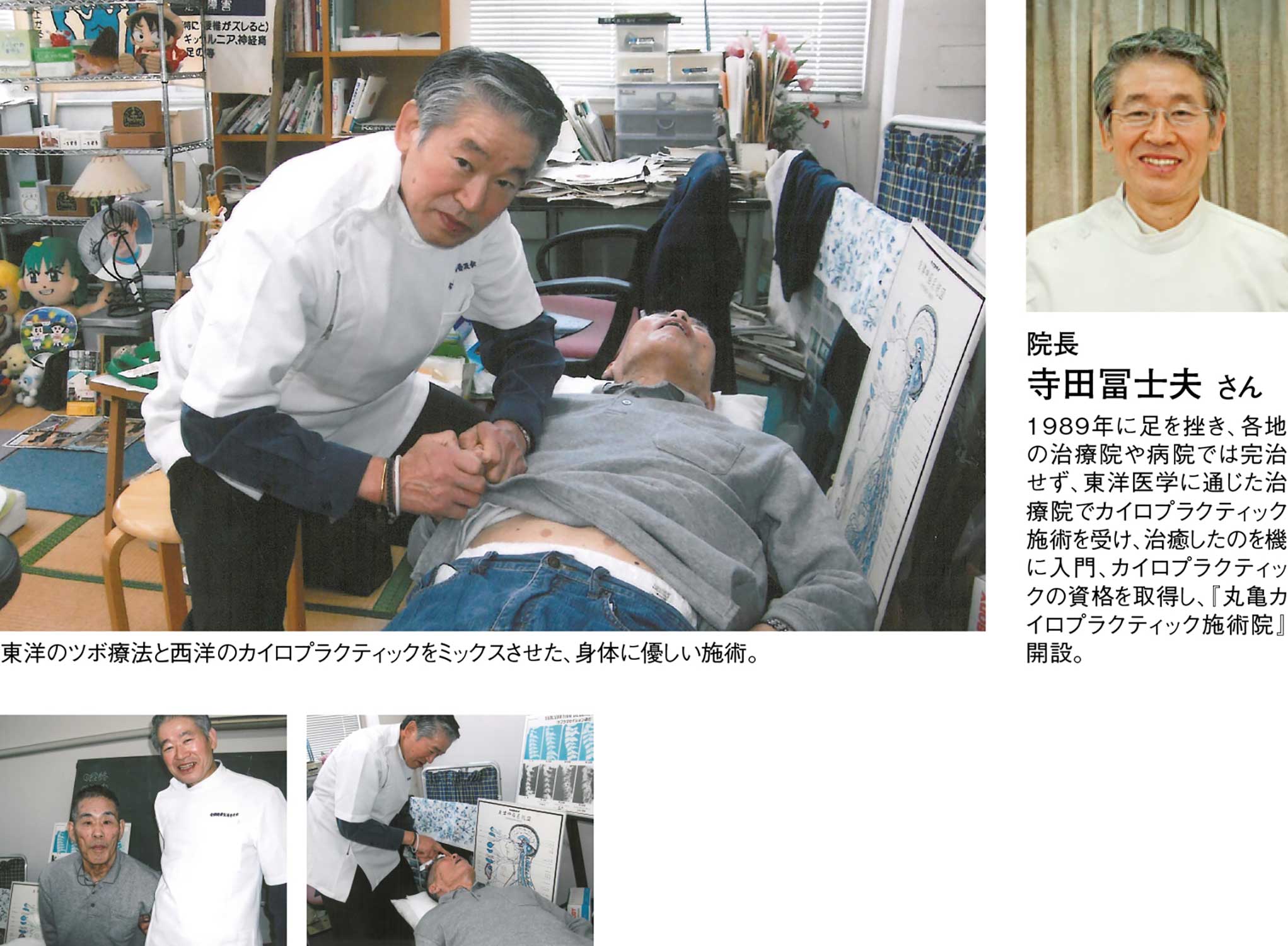 存命率10%といわれた心臓病などを患い、手術が成功し奇蹟的に職場復帰を果たした『丸亀カイロプラクティック施術院』の院長寺田冨士夫さんが入院中に密かにつかった「半導体物質」が手術に耐える体力の持ち直しに役立ったと確信、東洋のツボ療法と西洋のカイロプラクティックの利点をミックスさせた施術に加え、この「半導体物質」を施術に導入し、体の不調を改善に導く実績を重ねている。