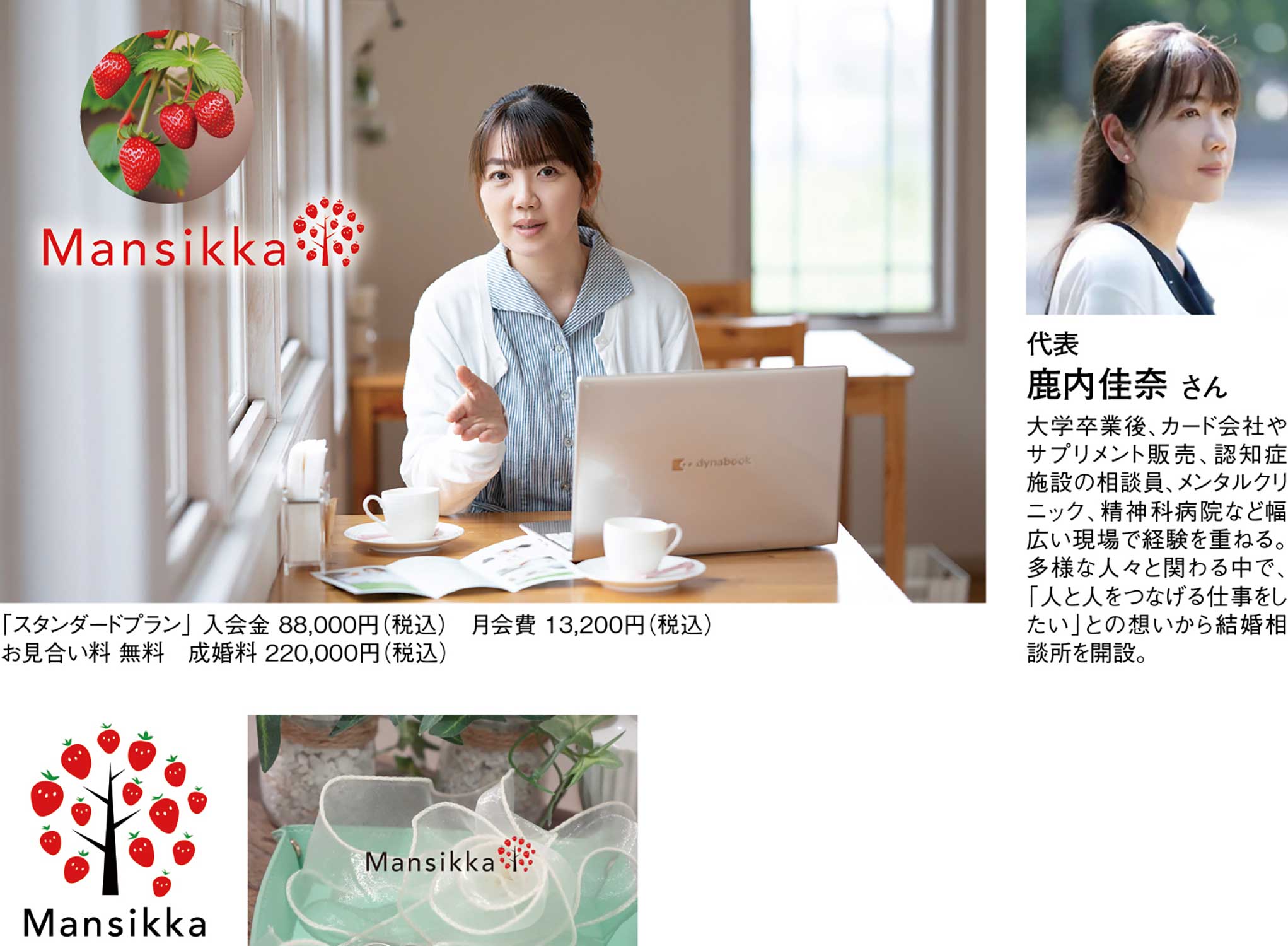 「自分を知り、自分を大切にする婚活」をテーマに、自分らしい幸せを第一に考えた婚活サポートを行う『婚活サロンMansikka』。サロン名の「Mansikka」はフィンランド語でイチゴを意味し、「尊重と愛情」「幸福な家庭」といった花言葉をもつ。代表の鹿内佳奈さんは、精神保健福祉士や認定心理士、ヨガインストラクター、アロマアドバイザーなど、多彩な資格を持つカウンセラー。カウンセリングでは、過去の経験や結婚観、相手に求める条件はもちろん、好きなことや苦手なこと、日々感じていることまで丁寧にヒアリング。幸福な家庭を築くために想いや個性を何よりも大切にしている。一人ひとりに合わせた活動プランを作成し、プロフィール作成や写真撮影のアドバイス、お見合いのセッティング、交際中のフォローまで丁寧にサポート。入会後は1年以内の成婚を目指し、大手IBJ加盟の強みを活かした全国規模のネットワークから理想のお相手を探し、成婚まで丁寧に伴走する。婚活を通して自分のことを知り、これからの人生をより自分らしく歩んでいくための幸せ探しをお手伝いする結婚サロンだ。