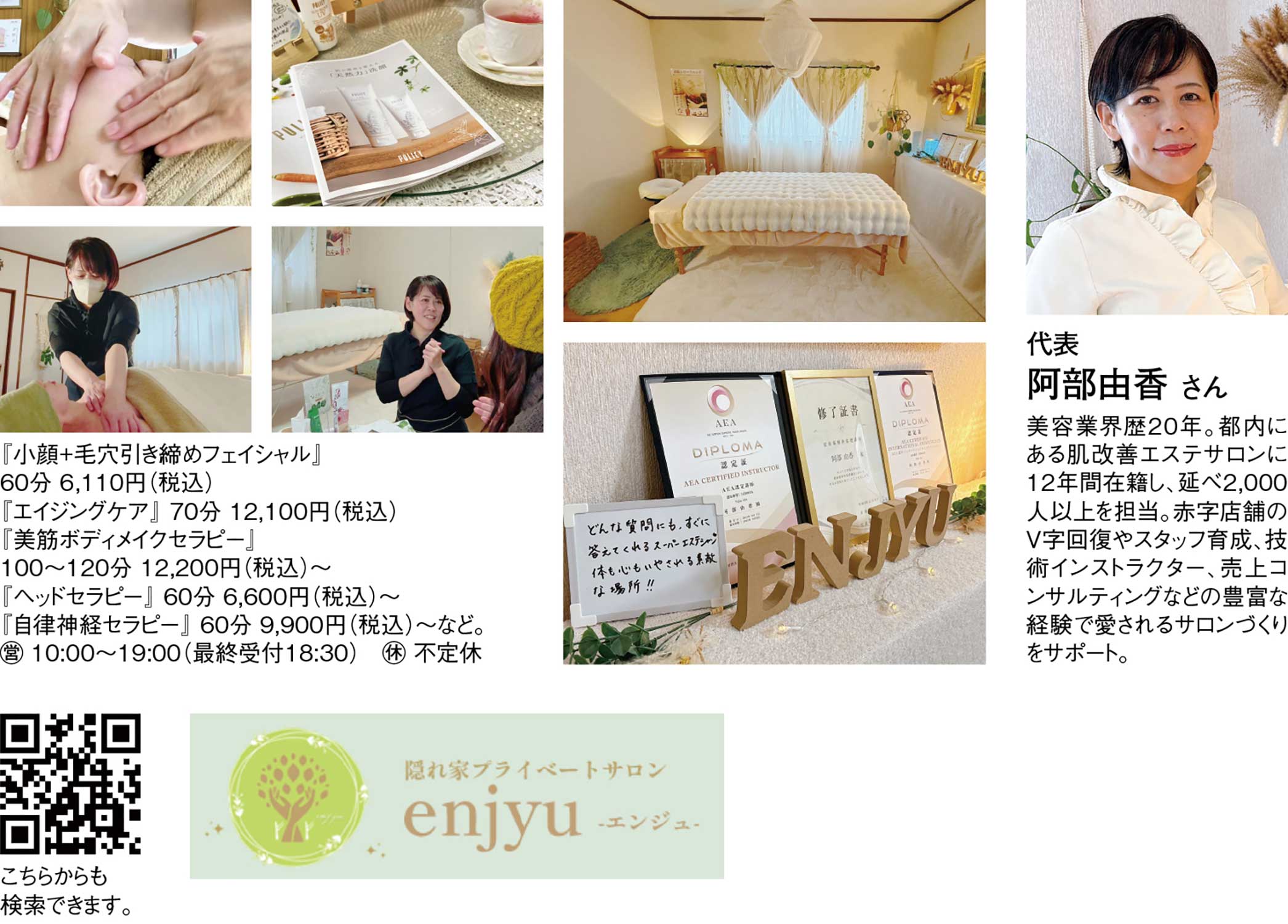 東洋医学の考え方をベースに、オールハンドの施術で肌・身体・心のすべてに丁寧に向き合う『隠れ家プライベートサロンenjyu』。丁寧なカウンセリングで生活習慣のクセや不調のサインなどを読み解きながら、年齢や環境と共に変化するお肌や体調、容姿のお悩みに寄り添う。一日2組限定完全個室の落ち着いた空間で、お客様によって本当に必要なケアを見極め、身体の外側・内側、さらに心の状態を根本から整えている。代表の阿部由香さんは、美容メーカーやサロンなど、美容業界に20年携わる美のスペシャリスト。東京の肌改善専門サロンで経験を積んだのち、「もっと深く身体のことを学びたい」と講師資格を取得。全国のサロンで技術指導や経営面のサポートも手がけ、AEAインターナショナルエステティシャン・認定講師としても幅広く活躍している。また、個人や自宅サロンの開業を目指している方や集客で悩んでいる方に向けたサロンの開業サポートにも力を入れている。技術や接客の指導はもちろん、継続してお客様に選ばれるサロンづくりまで、豊富な経験とノウハウを惜しみなく伝えている。