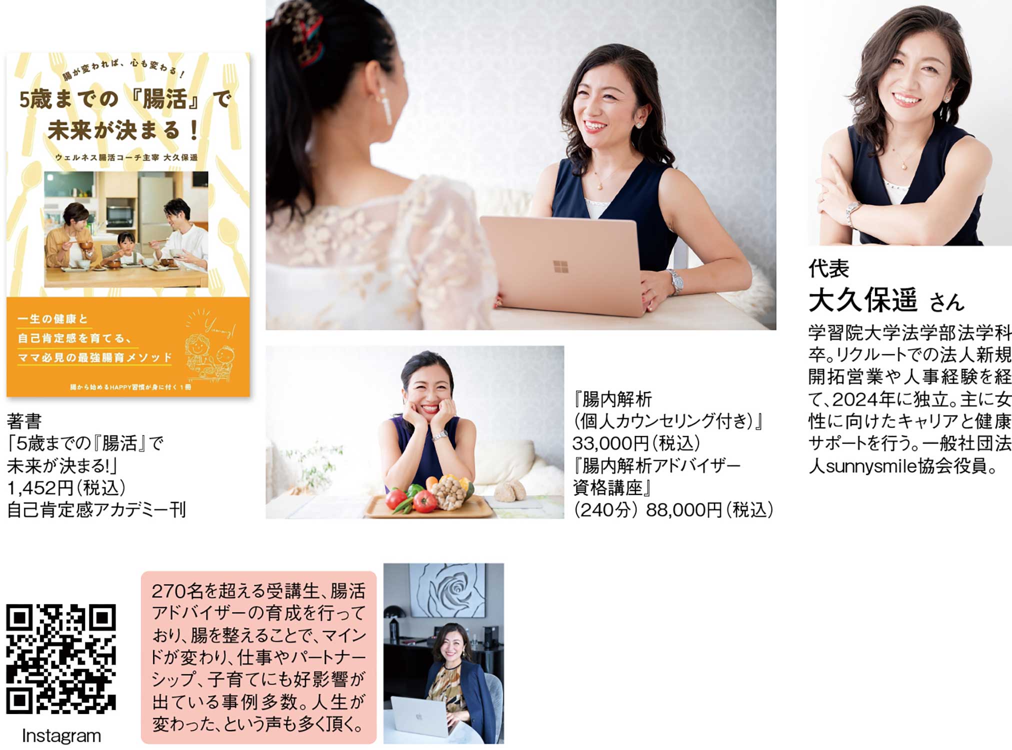 腸内解析を用いた腸活と自己肯定感を高める講座サポートやリクルートでの人事・コンサル経験で培ったキャリアコンサルで、キャリアや家庭・育児など女性が大切にしたいものを犠牲にすることなく、自分らしく叶えることをサポートする。『株式会社キャリウェル』代表の大久保遥さんは、大切な家族や子どもたちの時間を最優先にしたキャリアを実現することを実践してきた。その経験をもとにママたちのキャリア×ウェルビーイングを叶えるため、「子育てを学ぶ、当たり前の社会に」を理念に、子育て・健康・ビジネスを教える協会役員としても活動している。二兎を追って二兎を得るためには、まずは心身の健康がすべての土台。その要になるのが腸であるということを身をもって体感。腸内解析では、腸内年齢や善玉菌の種類、バランスなどを細かく分析。一人ひとり違う腸内環境の態を明らかにし、それぞれに最適な食事や生活習慣への改善を徹底的にアドバイスしている。第二の脳といわれ、思考力や感情、免疫にも影響するとされる腸を整えることは、心身のバランスを整えることにも直結する。心身の健康という台が整えば、仕事も家庭もよりスムーズに。忙しい毎日でも、自分らしく理想を叶えるためのサポートを行っている。