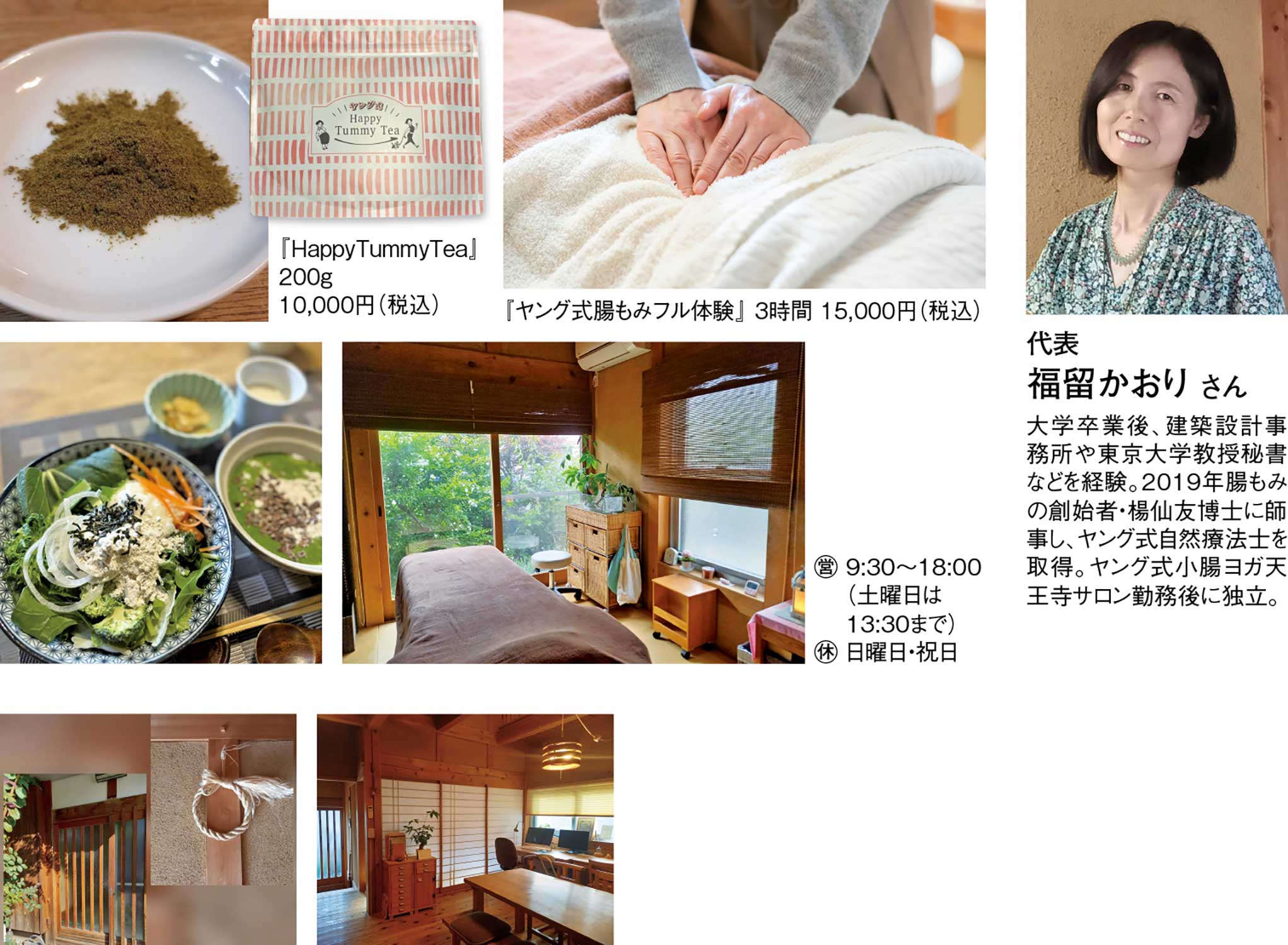 無垢の木に包まれた穏やかな空間で、腸もみ施術を行っているプライベートサロン『ナチュラルセラピー木癒香』。代表でヤング式自然療法士の福留かおりさんは、10代のころからナチュラルな生活を追究し、衣食住にはなるべく自然なものを選択することを大切にしている。2019年、『ヤング式腸もみ』に出会い、深く学びを重ねてサロンを開業。腸を本来の元気でキレイな状態に戻すことで、自然治癒力を高め、現代人の様々な病や不調が改善できることを伝え続けている。施術は、お腹全体を優しくもみほぐしながら、宿便剥がしを意識した丁寧な手技で深いリラックスへと導く。さらに宿便の排出を促すハーブティー『HappyTummyTea』、腸をキレイに保つ食事法『生穀菜食』で腸内を浄化し、健やかな身体づくりを目指す。「人生初の腸もみ体験だったが、リラックスして受けることができた」「宿便が出てお腹が軽くなった」など、体験者からの口コミが寄せられている。『ヤング式腸もみ』『ハーブティー』『生穀菜食』からのアプローチで忙しい日々の中でも自分を整える時間をサポートしている。(ライター/彩未)
