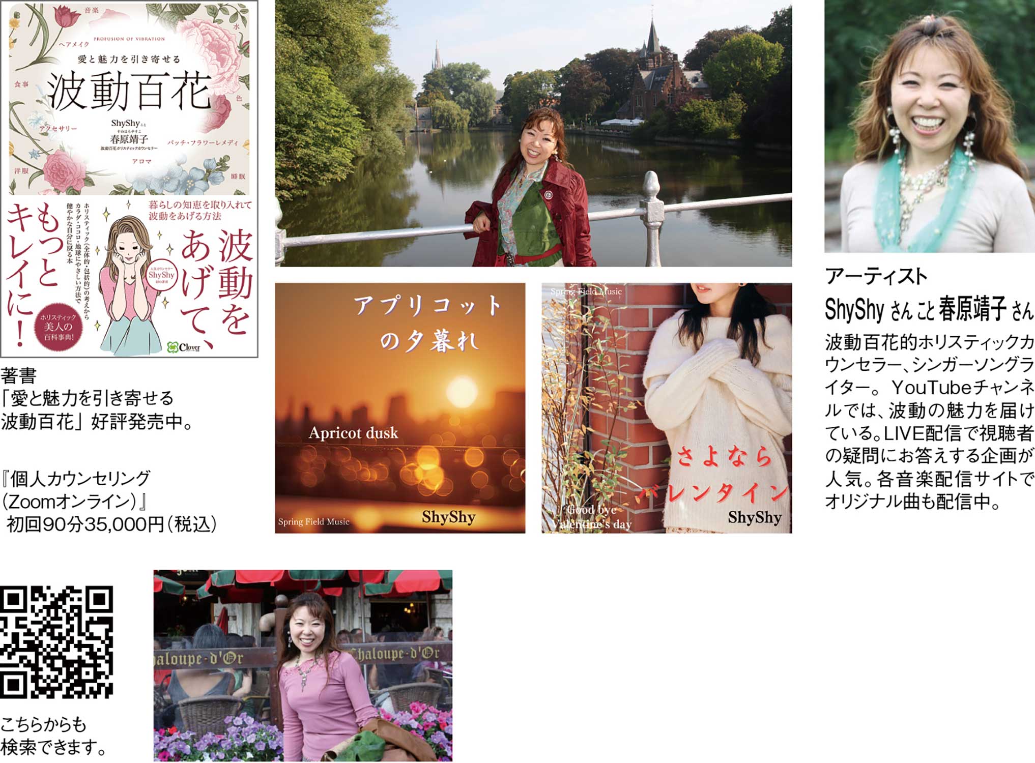 栄養やアロマ、睡眠、スピリチュアルなどを組み合わせた独自のアプローチで30年以上多くの女性の悩みに寄り添い続けてきたShyShyさんこと春原(すのはら)靖子さん。シンガーソングライターとしても活動している。これまでピアノコンサートやライブを中心に活動してきたが、自身の声を活かしてくれるアレンジャーとの出会いをきっ かけに、2024年3月から本格的にオリジナル楽曲のリリースを開始した。現在は、月に1回ほどのペースで新曲を配信しており、世界へ歌声を届けている。楽曲のテーマは、恋愛や人生の機微。生き方や心に響くメッセージと温かな歌声は幅広い世代に支持され、日本国内のみならず海外のリスナーからも共感の声が寄せられている。