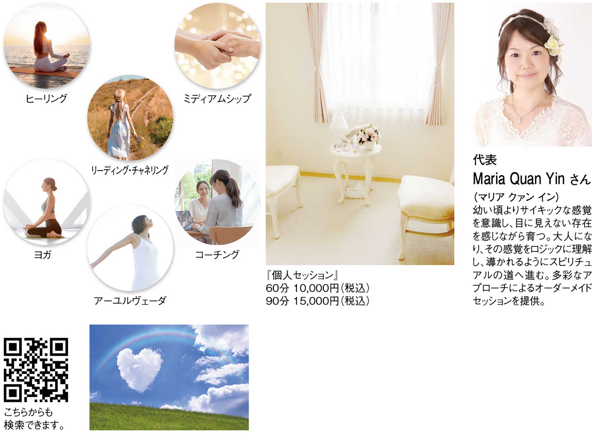 気持ち晴れやかに毎日をご機嫌に過ごすため の独自メソッドと多彩なアプローチで、心と身体 を整えてくれる『HAREYAKA358』。アーユル ヴェーダや瞑想、チャネリング、ミディアムシップ、 心理学など、目に見えない領域にアプローチする メニューを中心にしながらも身体のケアにも注目。 代表のMaria Quan Yinさんがフィットネス・ヨガインストラクターの経験を活かして、ヨガや手軽にできるストレッチなどもセミナー、講座、講演会で伝えている。また、コーチングにて目標・目的までのサポートもしてくれる。決まったプログラムに取り組むのではなく、その日の心と体の状態に合わせて柔軟にプログラムを構成するのが特長。丁寧なヒアリングをもとに、一人ひとりの悩みや課題に寄り添い、 様々な技法の中からその方に本当に必要なオリジナルセッションが受けられる。自分自身と向き合う方法や過ごし方、落ち込んだ時の対処の仕方などのエッセンスを学び、自分の中にある答えを見つけ、毎日ご機嫌に過ごせるようにお手伝いしてくれる。