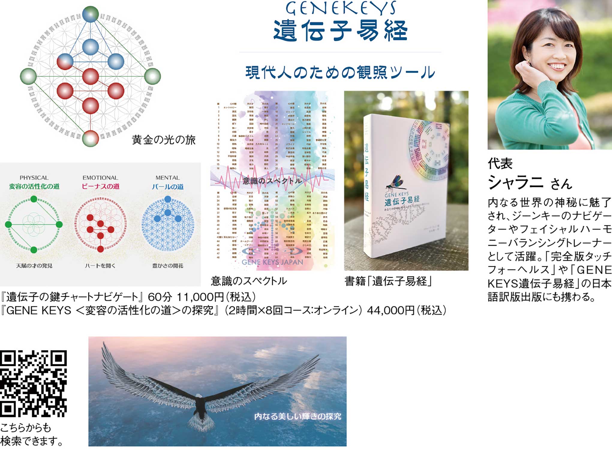『Inner Journey』のシャラニさんは、『GENE KEYS(ジーンキー)』の地図と羅針盤を使い、一人ひとりが自分の魂の設計図とつながり、自分らしく生きられるようにサポートしているナビゲーターだ。『GENE KEYS』とは、英国リチャード・ラッド氏が体系化した自己探求メソッドだ。易経の六十四卦と人間のDNAの64個が対応しており、それぞれの遺伝子の鍵は三つの周波数から成り立っている。生年月日、出生時間、出生地から導き出された羅針盤(遺伝子の鍵チャート)と地図(書籍「遺伝子易経」)を元に、押しつけや分析ではなく、ただ観ることを大切にしながら、自然なリズムで気づきの扉をひらいていく。天賦の才を発見する「変容の活性化の道」、ハートを開く「ビーナスの道」、豊かさを開花する「パールの道」を日常生活の中で観照することで、人生の変化や優しさを育むことができる。情報や答えを外に求めるのではなく、自分の内側にダイブし、自分だけの輝きをみつけたい人にこそ、出会ってほしいメソッドだ。