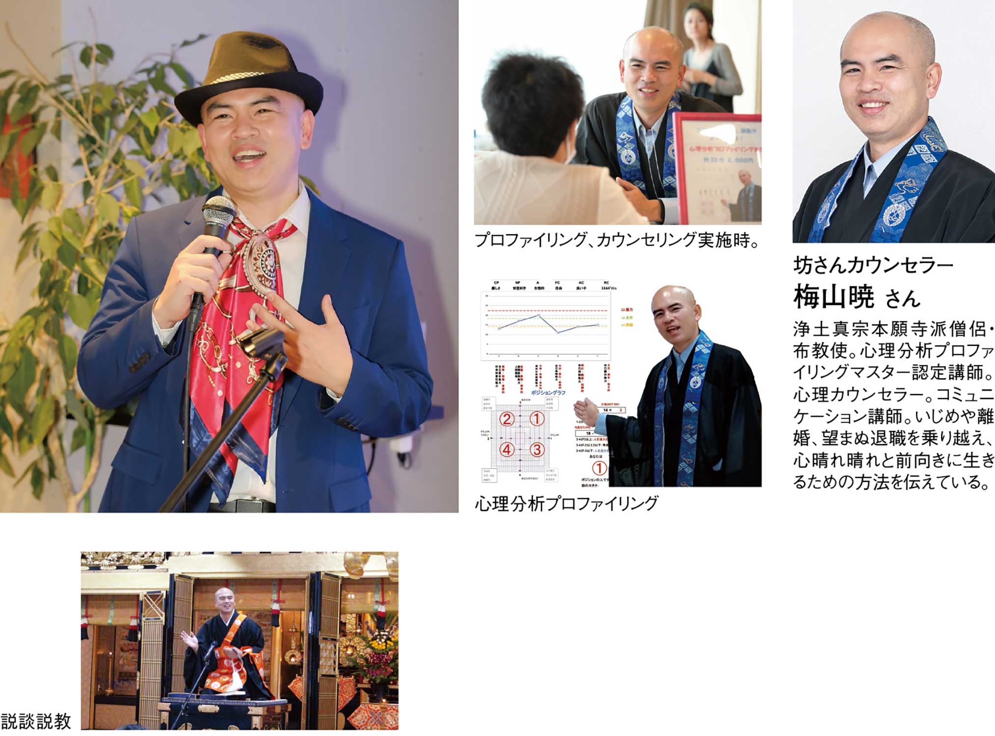 三重県いなべ市の浄土真宗本願寺派『龍岳山常満寺』の若院である梅山暁さんは、「安心お寺サロン」のお坊さんカウンセラーうめちゃんとして、個人セッションやワークショップ、講演活動などを通じ、自分らしく心晴れやかな人生を歩めるように寄り添っている。心理分析プロファイリングで自分自身の強みや可能性、課題を発見し、心の整理を進めてゆく。そこに仏教の智慧を添えることで、悩みや苦しみを抱える人々が自分を肯定し、前を向いて生きていけるように導いている。